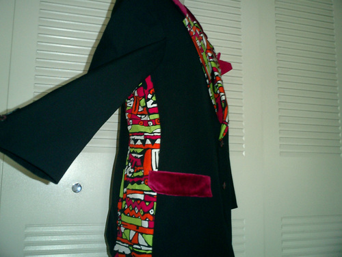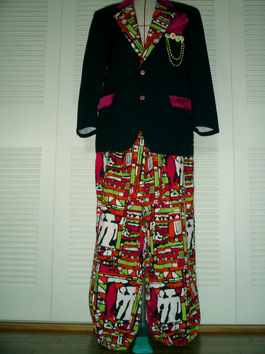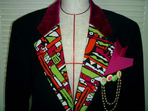 本人私物のジャケットの襟やサイドラインをNE時柄やゴールドチェーンなどでアレンジ。前、袖ボタンにはピンクのスワロフスキーを埋め込んだ。