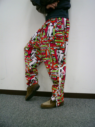 パンツはいわゆる「ジョッパーズ」のシルエット。ゴールドのハトメで穴をあけ、編み上げて絞ることにより、太ももふっくら、足首きゅっとした‘80sなラインに仕上がった。NE時柄バンダナでこだわりの「RYOPAC巻き」に。