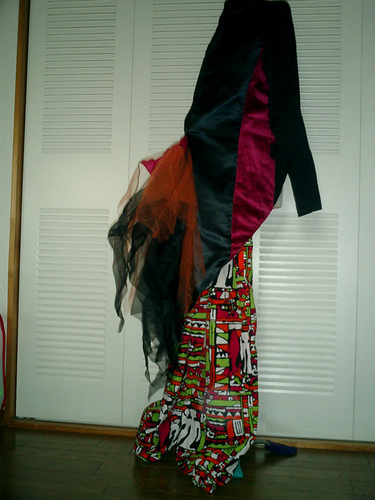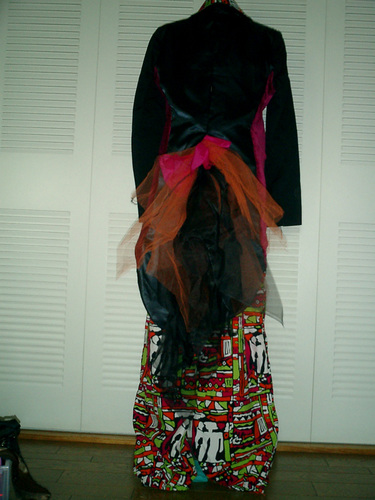 背中でまわるネジに使用した軽量の生地で背の高いシルクハットを製作。ほとんど重さは感じられない。古着のジャケットをエンビジャケットにリメイク。黒シャンタンの生地を使用し高級感のある大人なジャケットに変身させた。お尻から尾っぽがなびくデザインに。ウエストのハイベルト、ワイドイージーパンツ、など紳士的なラインに完成させた。