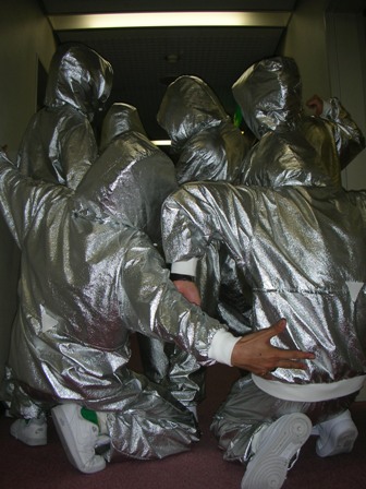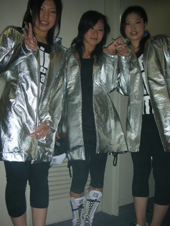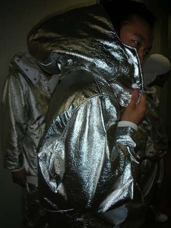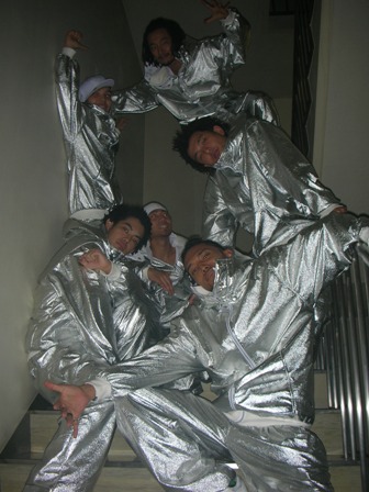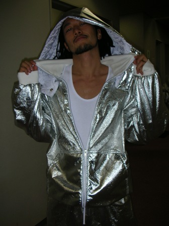 通気性を考えざるをえない、シルバー素材のセットアップ、ダンサー6人分。 同素材で生徒さんのシルバージャケット、18名分。